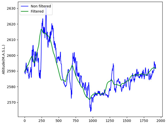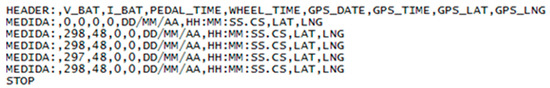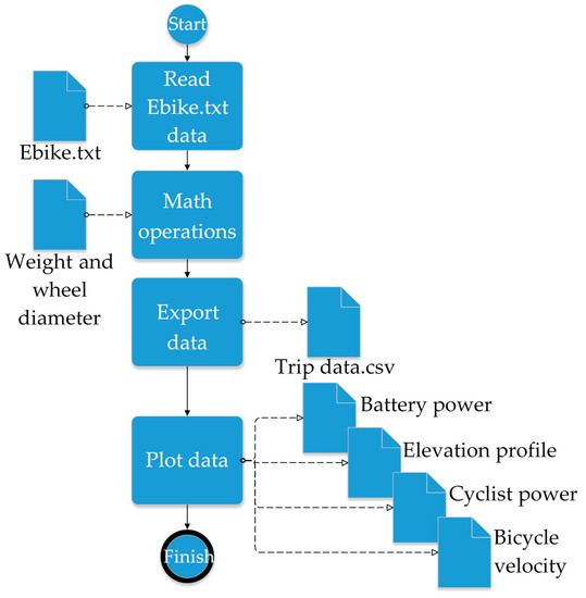 The processing software, designed with Python coding language, asks, in a first stage, for the following set-up parameters: wheel size, cyclist and bike weight, and the location of the “txt” file with the data recorded by the OBC. Then, it initiates the reading and processing algorithm to provide the bicycle velocity, the cyclist pedaling cadence, the e-bike battery power (by processing the e-bike battery voltage and its current), the route map, the elevation profile and the cyclist power. A flowchart of the processing algorithm is depicted in Figure 4.
