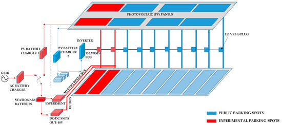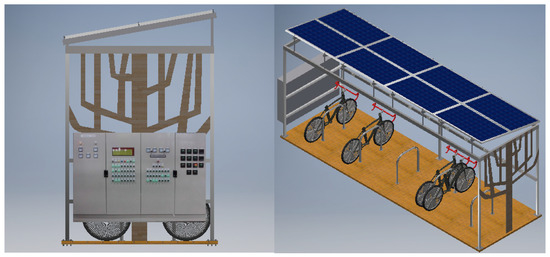 At the University of Naples, wireless charging stations for electric bicycles are proposed [33]. The charging station proposal uses photovoltaic energy and a resonant inductive power transfer system (RITP) to charge the bike battery without wiring. The idea of the wireless system is to reduce the need for significant alterations to parking spots while maintaining the possibility of placing the bike without making a connection. The parking spot is endowed with the primary winding and the secondary winding is on the bike. The inductive charging system transfers the high frequency AC (alternating-current) power signal from the charging station to the secondary winding on the bike to be regulated into the DC (direct-current) signal required to charge the bike´s battery. The photovoltaic generation intends to give the system some autonomy from the grid by including batteries. However, it has a connection to the main grid which requires an electronic system of modular converters for the management of energy flow. Therefore, since it has connections to the main grid, solar panels and batteries, this charging station proposal is, actually, a distributed energy generation system.