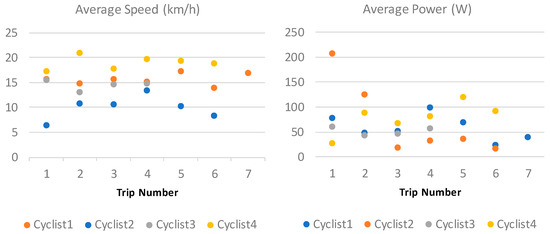 Parameters used in Equations (2)–(6), such as the rolling resistance coefficient, , the frontal area, , and the drag coefficient, , are not calculated for each cyclist and bike, but included within the averaged values; therefore, results are expected to approximate the real power used by the cyclist. The fixed parameters used in Equations (2)–(6) are given in Table 2.