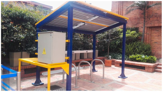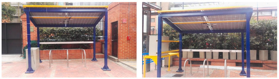 In Figure 27 and Figure 28, the BiCiSolar charging stations available at Sergio Arboleda University are shown. Two stations were implemented so that ten e-bikes can be simultaneously charged. Each station is located in the university campus with the solar panels facing south at a fixed 6° angle to the horizontal.