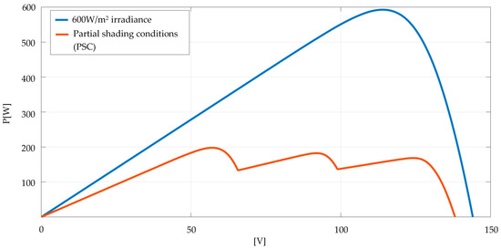 Power-voltage (P-V) curve with uniform 600 W/m2 irradiance (blue) and P-V curve due to PSC phenomena (red) in BiCiSOLAR charging station.
