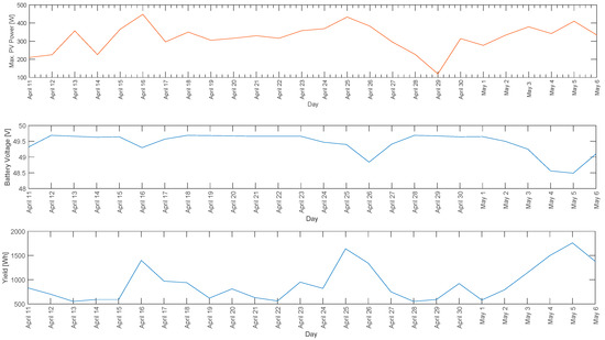 Figure 31 shows that despite variations in power generated by the PV array due to irradiance variation and meteorological conditions (cloudy days), battery voltage remains almost constant at around 49.5 V, with small variations of smaller than 2% of the battery charge. Consumption (in Wh) shows that the day the charging station was used most was 5 May. The lowest consumption corresponds with weekends and holidays.