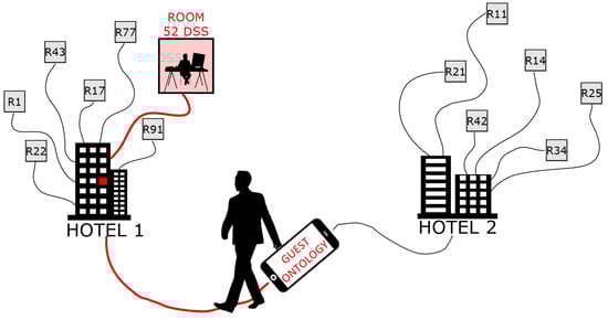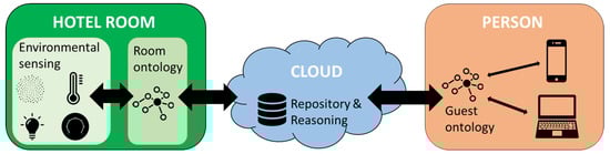 Figure 1 shows a business traveller booking a room in a hotel which uses the RoomFort framework, bringing together his/her own personal and health-related ontologies. Leveraging on the possibility to access to all the knowledge formalized in the ontologies, RoomFort can operate as an application that configures the comfort metrics in the room according to the guest’s needs and preferences [52]. The key feature of this proposed architecture is the focus on the guest, as an individual with specific needs or desires. In this context, RoomFort aims at providing him/her with tailored comfort metrics, with the final goal of increasing his/her satisfaction. As shown in Figure 2, RoomFort relies on a cloud-based architecture. The application operates on a private cloud enclave that stores the information of the booked room, the environmental sensing data and the ontologies related to the guest. In this way, the reasons behind an actuation are only available on the private enclave and stay hidden to hotel personnel, thus, safeguarding guests’ privacy.