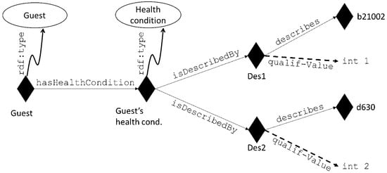 An example of the modelling of a guest’s health condition; individuals are represented with diamonds, concepts are represented with circles, and roles are represented with arrows (dashed arrows indicate datatype properties, full-line arrows represent object properties). The type of an individual is stated with a curved arrow.