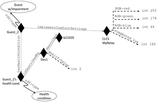 This module gathers the guest’s registry records, data provided by the guest when he/she reserves his/her room. These data are modelled as objects of datatype properties and provide the means to represent the first name, last name, date of birth, tax identification number of the guest—who is represented as an individual. Using an object property, each guest is connected to his/her health condition, represented as an individual. The modelling of each health condition reuses the ICF ontology, as illustrated in Figure 4.