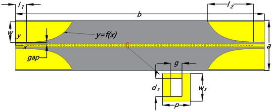 The strip width, gap size, and length of the CPW TL close to the ports were chosen as w = 30 mm, gap = 0.5 mm, and l1 = 16 mm, respectively. The length of the transition region was set to be l2 = 66 mm based on a tradeoff between a good matching and a small size of the proposed LWA. The origin of the coordinate was set at the center of the CPW port. To convert the quasi-TEM to a SSPP wave with a high efficiency in broadband, the flaring ground was designed as an exponential curve as follows [14]: