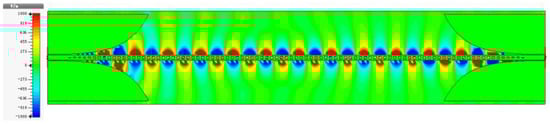 Although an SSPP TL does not have a ground plane, it can also bound electromagnetic waves, as we know. Figure 2 shows the dispersion characteristic of the proposed SSPP TL which is simulated with the Eigen-mode solver of CST Microwave Studio. The dispersion curve of the SSPP TL is always below the light’s dispersion line in its working band because an SSPP wave is a slow-wave (), and there is no radiation mode under the cutoff frequency. Figure 3 displays the simulated y-direction E-field distribution on the substrate at 10 GHz, and it appears binding TM waves on the surface metal strip. From Figure 3 we can also see smooth conversions between guided waves and SSPPs. In the CPW sections, conventional guided waves are supported. Along the matching transition sections, the guided waves are gradually transformed to SSPP waves. In the TL section, the E-field distribution behaviors like a surface plasmon polaritons, which means that SSPP waves are supported.