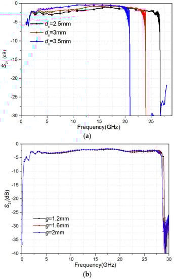 The simulated S21 of SSPP TL with different size of slots. (a) Different ds when p = 1.6 mm; (b) different g when ds = 2 mm.