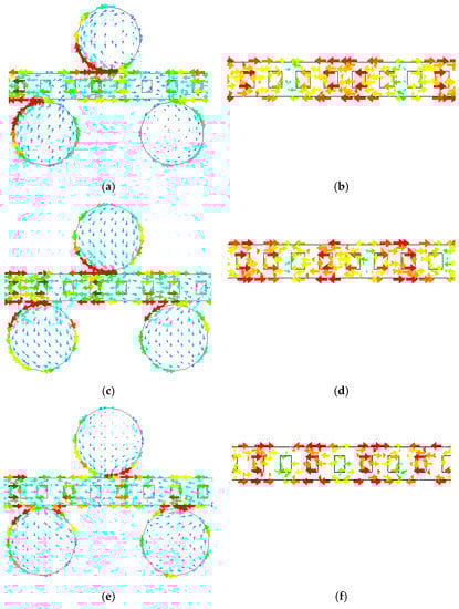 To investigate the coupling mechanism and the electromagnetic radiation, Figure 8 shows parts of the surface current distribution on both the SSPP LWA and SSPP TL at different frequencies. The simulations use a time domain solver in commercial software CST Microwave Studio. In order to achieve the maximum energy coupling, circle patches should be placed in the positions with the maximum current of the SSPP TL. However, the periods of maximum currents in phase on SSPP TLs are different at different frequencies, as shown in Figure 8b,d,f. To achieve a wide-angle beam scanning, the broadside frequency 12 GHz is to be set first. Thus, the period distance between every two of the circle patches is chosen to be d = 20 mm, which is just the period distance between every maximum current in phase at 12 GHz as shown in Figure 8c. Figure 8a displays the surface currents of SSPP LWA at 8 GHz, which brings a backward beam scanning. Figure 8f displays the surface currents of SSPP LWA at 15 GHz, which brings a forward beam scanning. From Figure 8a,c,e, we can see the surface currents couple between the TL and the patches to change smoothly, and the electromagnetic energy radiates to space in phase.