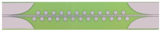 Figure 6 shows the structure of the proposed SSPP LWA fabricated on a FR4 substrate with εr = 4.3, tan σ = 0.025 and a thickness h = 0.5 mm. The SSPP TL and the substrate are the same as those shown in Figure 1. The circular patches are interlacing, placed at the two sides of the SSPP TL. The patch-loading here is used to convert surface waves into radiating space waves. The distance between the patches and the metallic strip is related to the couple which is set based on the requirement for radiation pattern. The diameter of the circle patch is D = 10 mm, which makes the radius equal to one quarter of the waveguide wavelength, approximately. The period is d = 20 mm, which is just the distance of two of the circle patches. The offset on the both sides of patches is delta = 10 mm, it equals half of the period d, which will discussed in the following. Real copper was chosen with an electrical conductivity of 5.96 × 107 S/m. All the patches are t = 0.5 mm away from the TL to couple the energy from SSPP TL properly.