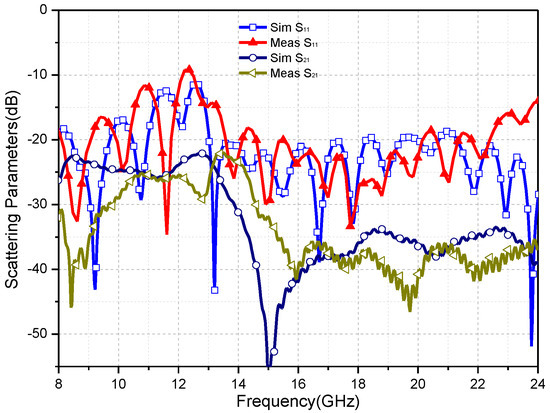 The proposed SSPP LWA was fabricated and measured to validate the design above. A photograph of the fabricated prototype is shown in Figure 10, and the sizes are shown in Figure 6. Figure 11 shows the simulated and measured reflection coefficients S11 and transmission coefficients S21 of the SSPP LWA. The reflection coefficients S11 are below −10 dB over all bandwidths. It is a little bit worse at 12 GHz because 12 GHz corresponds to the broadside direction which always creates the maximum reflection. The transmission coefficients S21 are below −22 dB over all bandwidths. Compared to a conventional LWA, the proposed SSPP LWA obtains a high radiation efficiency. The measured S21 responses do not agree well with the simulated ones at some frequencies. The difference comes from the loss of connector assembly and measurement error especially under −20 dB. However, since the S-parameters are shown in dB, the real difference is not very large under −20 dB.