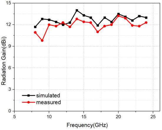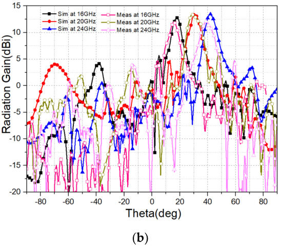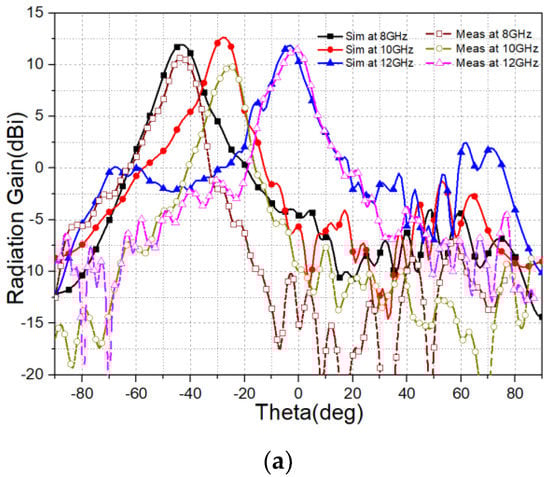 Figure 12 shows the simulated and measured radiation patterns of the proposed SSPP LWA at different frequencies. The simulated and measured results show that the proposed LWA continuously scans from −45° to 45° as the frequency increases from 8 to 24 GHz. The side lobe is lower than the main lobe by −10 dB. The backward beam scanning is shown in Figure 12a, where the broadside direction is 0° at 12 GHz, and the forward beam scanning is shown in Figure 12b. The radiation characteristics are consistent with the predictions based on the dispersion diagram in Figure 7. The proposed SSPP LWA offers a possibility of continuous beam scanning through the broadside with almost the same gain, without a drop in radiation performance at the broadside direction compared to conventional LWAs [24].