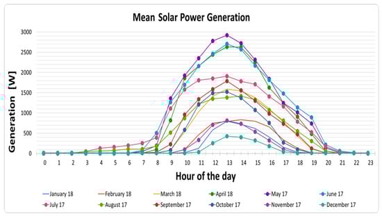 To conclude, from the Pearson’s correlation analysis presented in this section, it can be clearly noted that both GHI and temperature can be used as useful parameters in estimating the power generation of the solar panels. This fact is illustrated in Figure 2, Figure 3 and Figure 4 that capture power generation, global horizontal irradiance, as well as ambient temperature, respectively, during the period between 1 May 2017 and 30 April 2018 such that the X-axis of those figures denotes the hour of the day scaled between 00:00 and 23:00 on an hourly basis. Furthermore, Figure 5 demonstrates the average yearly power generation and irradiation. It can be seen from those figures that peak power generation happens at 13:00, which coincides with the corresponding peak values of irradiation and temperature. It is important to note that, although the gathered data sources are from the southern region of Bavaria (Germany), the derived conclusions of this section are generic enough to be applicable to any region having similar characteristics as the one considered in this paper.