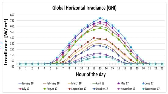 Global horizontal irradiation on a monthly basis given in 24 hours per day.