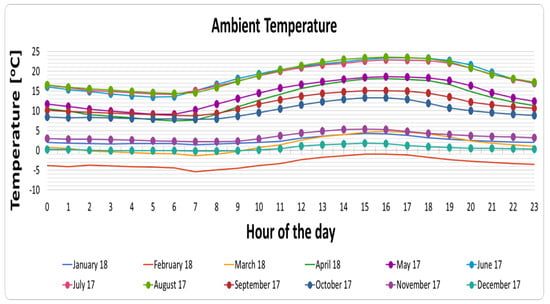 Ambient temperature on a monthly basis given in 24 hours per day.