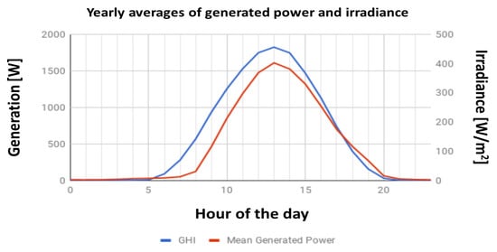 Generated power and irradiation on a yearly basis given in 24 hours per day.