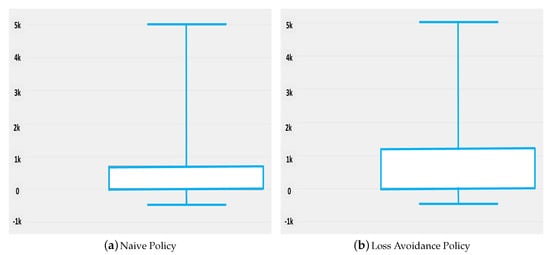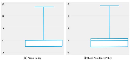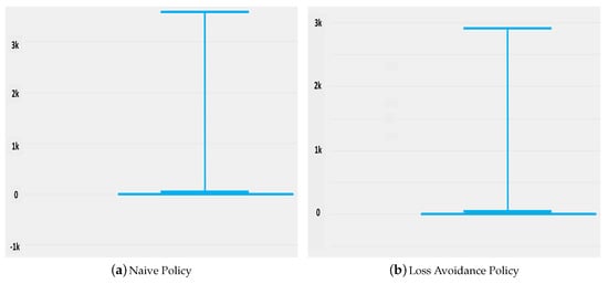 We start by analyzing the charging behavior of ESS, which is illustrated in Figure 7 and Table 6. The minimum value for the “Naive” policy (see Figure 7a) arises from discharging the ESS to satisfy the load of 500 W during hours without forecasts. On the contrary, the “Loss Avoidance” policy (see Figure 7b) selectively discharges the ESS to reserve enough charging capacity for later. The maximum value can be considered as a spike which is confirmed by the plots’ upper whiskers. The amount of energy charged by the “Loss Avoidance” policy during the observation period is 753 kWh higher.