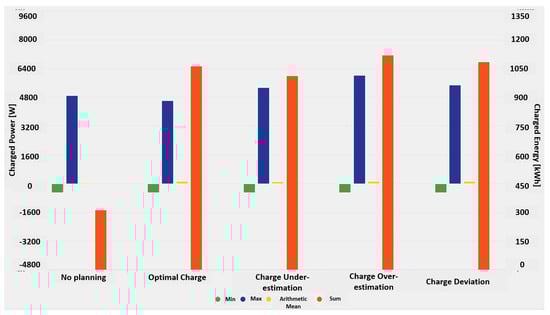 Figure 10 shows the charging behavior of the different considered scenarios, where the right and left vertical axes denote total charged energy in the ESS (Wh) and charging power (W), respectively. Minimal, maximal, and mean values are related to the left axis, whereas the sum values to the right axis. Usage of the “Loss Avoidance” policy provokes higher net charge, and much higher discharge rates regardless of prediction discrepancies. The higher net value results from better generation utilization on the one hand, but, on the other hand, they are the result of loss of load. The degree of efficiency for charging and discharging is both 93%, so if energy is stored and then fed into the grid, only 86.49% of the generated energy reaches the grid. This adds up and increases the net charge value as the amount of energy is measured before charging and after discharging. The higher discharge rates are clearly a result of strategic planning. For Algorithm 1, the maximum discharge is 500 W to satisfy the equally high load during times of no generation, whereas Algorithm 2 deliberately discharges the ESS to reserve future charging capacity in order to prevent generation curtailment.
