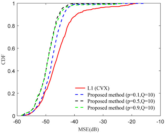 As discussed in the above section, in this paper the non-linear nature of () norm minimization is alleviated by a random search associated to a convex local minimizer. The random starting points explored in the procedure are selected randomly in the shifted null space of matrix . In order to investigate the effectiveness of the proposed method, in Figure 2, Figure 3 and Figure 4 the Cumulative Distribution Function (CDF) of the Mean Square Error (MSE) of the retrieved solutions obtained by proposed method of random search-convex local minimizer is plotted considering three representative non-convex norms, i.e., strong non-convex norm (), moderate non-convex norm () and weak non-convex norm () with the number of random starting points , respectively. In the same figure the CDF curve of () norm minimization using MCCA and the standard norm minimization using CVX convex minimization software package [30] are also plotted for sake of comparison. For each case, a number of 500 trials have been considered, randomly changing the positions of the broken elements. The plot shows that a value of Q equal or higher than 10 is able to overcome the strong non-convex feature of norm and provide better performance compared to standard norm minimization. While for the moderate non-convex norm, i.e., , a smaller number of random starting points, i.e., is enough to have satisfactory result.