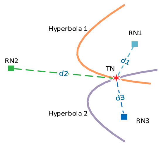 A TDOA-based localization system is used to determine the position of the transmitter by measuring the TDOA of the transmitted signal at pairs of receivers whose position is known, where the transmitter and receiver are also known as target node (TN) and reference nodes (RNs). The basic structure of the system is shown in Figure 1, which includes several RNs and one TN. denotes Euclidean distance between the TN and the RN :