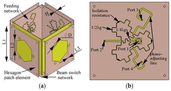 Figure 3a,b, respectively, depicts the configuration of the proposed BSBCPA and its feeding network. The BSBCPA consists of four identical hexagon patch elements and their respective feeding networks and a beam switch network placed below the patch elements. The hexagon patch element is fed by three capacitive disks in the same layer to compensate for the inductance caused by long probes. The feeding capacitive disks are directly connected to the output ports of the feeding network via three long metallic probes passing through an air gap of height H. In order to achieve broadband circular polarization, equal amplitudes and relative 120° phase differences are required between three feeding ports [15]. Therefore, a Wilkinson power divider with three output ports is introduced as the feed network, and there is a one-third wavelength difference between the output ports, where port 1 is the input port and ports 2, 3, and 4 are the output ports. In addition, for good AR bandwidth, low coupling between output ports of the feeding network should be guaranteed. Therefore, half-wavelength transmission lines are introduced to bridge the isolation resistances between the output ports of the power divider, as they do not change the impedance characteristics of the transmission line. In order to match the output ports, the added isolation resistances should be 150 ohms. The feeding networks are connected to the beam switch network via cables.