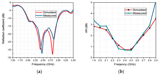 (a) Simulated and measured reflection coefficients. (b) Simulated and measured ARs.