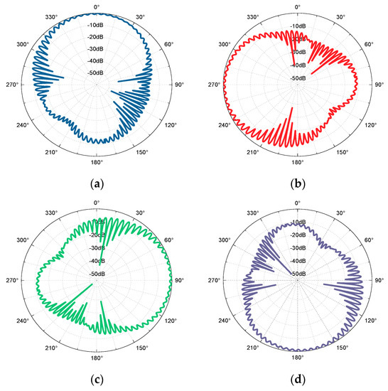 Measured radiation patterns of four states in the azimuth plane. (a) Radiation at 0°. (b) Radiation at 270°. (c) Radiation at 90°. (d) Radiation at 180°.