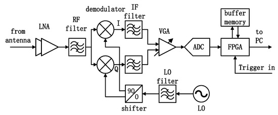 The hardware architecture of the receiver is shown in Figure 6. Behind receiving antenna, a two-stage LNA and a RF filter are respectively used to amplify the received signal and suppress out of band interference. Then the received RF signal is demodulated to the baseband signal consisting of the in-phase and quadrature component by a local oscillator (LO). Subsequently, the baseband signal is filtered by a low-pass filter with a 3 dB cut-off frequency of 25 MHz and amplified by a variable gain amplifier to maintain the output voltage within an appropriate range. After 80 MSps ADC sampling, when a trigger signal is received, the digital signal is temporarily stored in the buffer memory by the FPGA and finally uploaded to the PC.