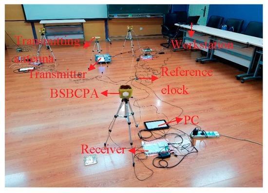 Two experiments were carried out in a real environment. In the first experiment, RF cables were used as channels to avoid the multipath propagation. In the second experiment, two different indoor environments, the conference room and the laboratory, were used for 2D indoor location estimation. Both places are static environments with LOS and complex multipath, and the measurement scenario in the conference room is shown in Figure 7. By adjusting the output power of the transmitter, at least SNR of 10 dB is guaranteed in every TDOA experiment. Each position in the statistical result is estimated by 100 TDOA calculations, and 1024 samples are applied for each TDOA calculation.