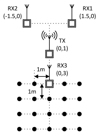 In this experiment, the BSBCPA and OLPA were used separately as receiving antenna to evaluate the multipath propagation mitigation. Both the transmitting and receiving antennas were placed on tripods at an altitude of 0.8 m from the ground. For convenience, the transmitter (TX) and the two receivers (RX1, RX2) are fixed, and the third receiver (RX3) is moved around in steps of 1 m for a total of 20 positions. The specific measurement configuration is shown in Figure 8. When the BSBCPA was used, omnidirectional scanning was first performed by switching four beams of the BSBCPA after each shift of RX3 without prior knowledge of the target direction, and the received signal in each beam was uploaded to the PC for comparison. Since the received power is maximum when there is a direct path between the transmitting and the receiving antenna, the excited patch element for localization is selected by the received signal having the maximum power. TDOA-based positioning measurements were performed after determining the excited patch element.