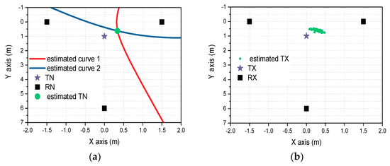where and are the coordinate of the TN and the RN . The distance difference between two RNs can be obtained by one TDOA estimation: