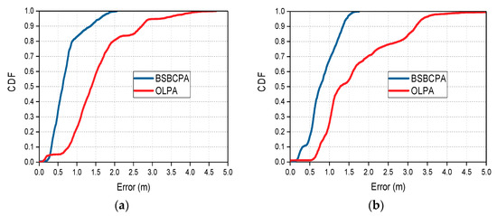When the RX3 is at location (0, 6), the positioning results for one time and 100 times are shown in Figure 9. The positioning results for each location in two different indoor environments are shown in Table 3. It can be seen that in most positions, the BSBCPA performs better. The mean error at all positions using the BSBCPA and OLPA in the conference room is 0.7 m and 1.53 m respectively, and the results in the laboratory is 0.82 m and 1.7 m, indicating that the positioning accuracy improved by at least 51%. The cumulative distribution function (CDF) of the positioning error is shown in Figure 10. Similarly, the BSBCPA performs better with a median error of 0.62 m in the conference room, and the OLPA only achieved a median error of 1.39 m. In the laboratory, the BSBCPA and OLPA achieved median errors of 0.76 m and 1.27 m, respectively.