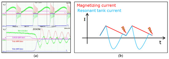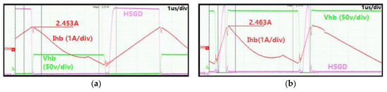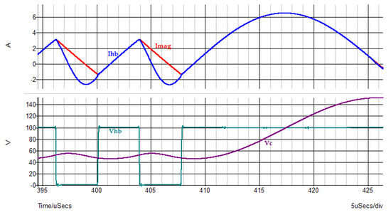 Figure 6 shows actual measurements of the effect of the input voltage and the output current on the magnetizing current. In particular, Figure 6a,b show that the peak current of the tank circuit is independent of the input voltage and has the same peak value because the output load is the same, 0.6 A. Figure 6c,d show the same effect with a load of 3.25 A. The value of Ihb peak current is given by Equation (9).