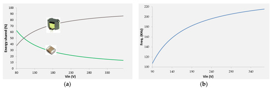 (a) Percentage of energy stored during the charge phase of the converter over Vin, Vcr = 50 V; (b) switching frequency of the resonant converter over Vin using the proposed control method.