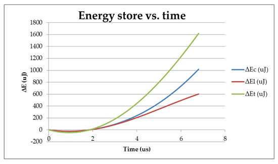 Under heavy load conditions, where longer charge times are required, it can be observed that the percentage of energy accumulated by the capacitor is even larger compared with the approximation previously used of small tc time. Figure 7 shows the magnetizing current and resonant capacitor voltage over time, and Figure 8 shows the stored energy of each element over time.