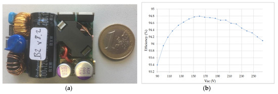 The dimensions of the final converter (see Figure 9a) were 51.5 × 38 × 19 mm, achieving a power density of 29 W/inch3. The prototype achieved a minimum efficiency of 93.4 at a 90 Vac input and a 65 W load measured at the board connectors.