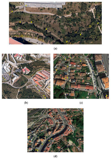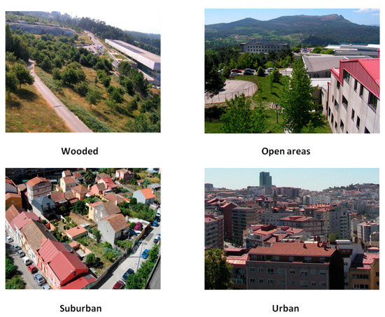 We carried out measurements in four types of macrocell environments: open, wooded, suburban, and urban areas (Figure 2). These zones could be typical environments for 5G cellular deployments. The open areas selected were located on the Campus of the University of Vigo. In the wooded environment we could find different types of trees between the Tx and Rx that could cause minimal or strong signal shadowing. The wooded environment could show the effects of the radio link blockage by the vegetation. The suburban environment consisted of typical streets and roads with two- to three-story houses and buildings that lined the streets. The urban scenario was characterized by the presence of street canyons with buildings of 5–10 floors.