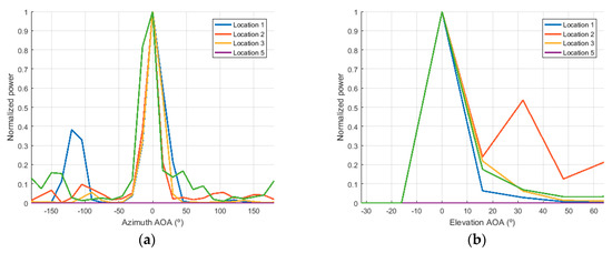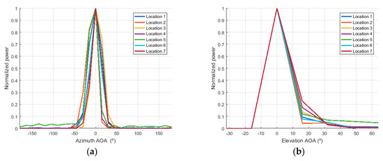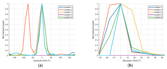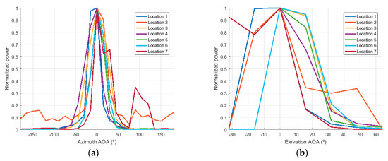 The azimuth rms LAS was slightly over 11° for all the environments, except for the wooded one, where it increased to 14.6°. The elevation rms LAS values were lower for the open environment and higher for the wooded one. The rms LAS value found in the urban environment, corresponding to 9.7°, was between the 7.8° and 10° reported by other studies [32,40], from measurements at 28 GHz in Manhattan. It is not far from the values proposed by the Winner II model [28], which are between 11° and 15° for channels at 60 GHz. The values found for 73 GHz, i.e., 6° in reference [32], are smaller.