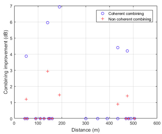 In Figure 10, we plotted the combining improvement as a function of the distance between Tx and Rx. We can clearly see the higher coherent combining values but we cannot appreciate a clear trend of the combining improvement with respect to the distance.