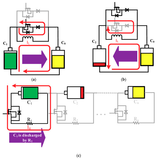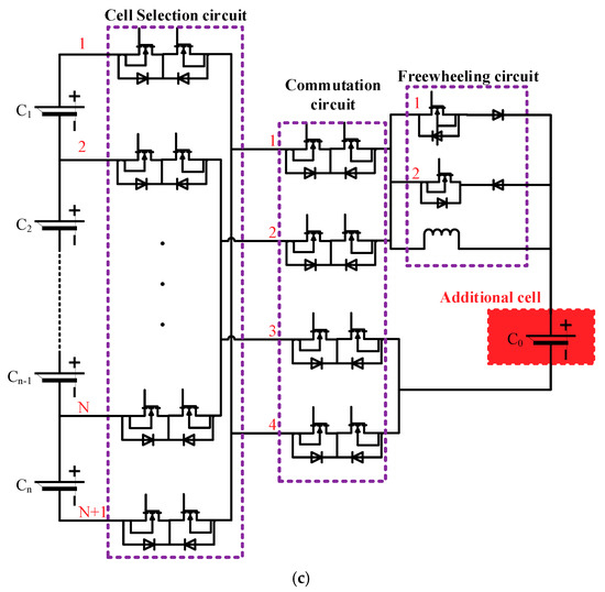 Figure 1c, the active equalization circuit mainly includes a cell selection circuit, a commutation circuit, a freewheeling circuit, and so on. The cell selection circuit is used to select the cell to be equalized in the battery pack. The function of the commutation circuit is to make the positive and negative polarity of the cell which is to be equalized the same as the additional cell. The circuit includes four parallel branches. The freewheeling circuit consists of diodes, MOSFETs, and an inductor, and is used to buffer the current of the circuit and protect the circuit elements from being damaged when the circuit is switched on or off.