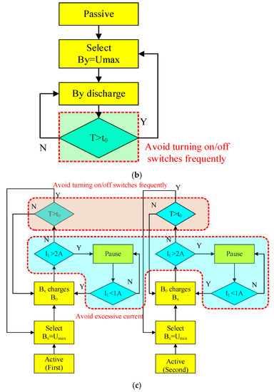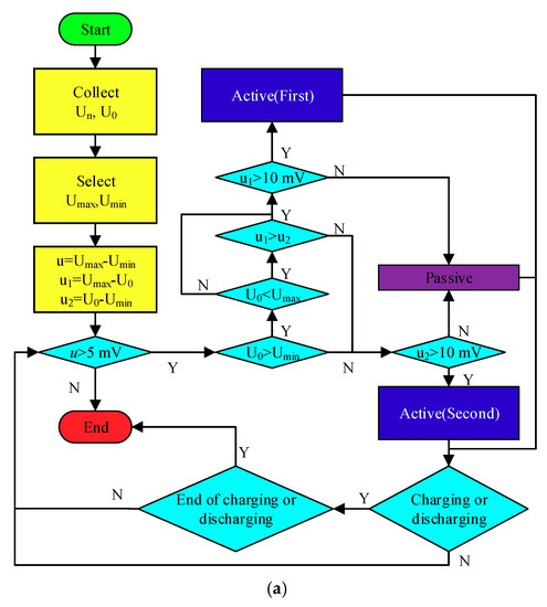 (2) A composite equalization algorithm containing three equalization modes is proposed. The equalization mode can be switched automatically according to the state of the cells. When the voltage difference between the cell to be equalized and the additional cell is large, active equalization will be used. When the voltage difference between the cell to be equalized and the additional cell is small, passive equalization will be used. The algorithm combines the advantages of the different equalization methods.