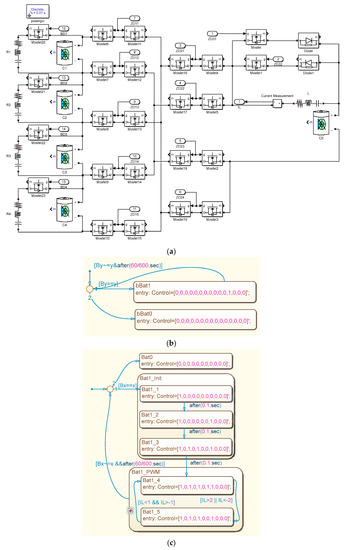 In this section, we use the Simscape module in MATLAB/Simulink (MathWorks, Natick, MA, USA) to build a physical model of the composite equalization circuit, and we model the equalization control strategy and algorithm in Simulink/Stateflow. The simulation model is shown in