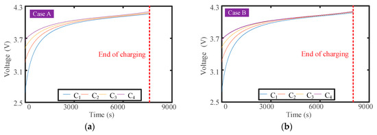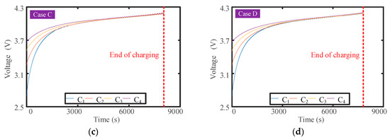 In this study, four cases marked as case A, B, C, and D are set to simulate the equalization effect under charging conditions, and the simulation results are shown in