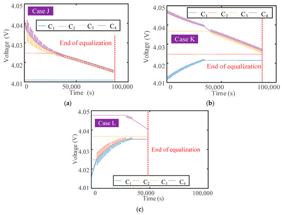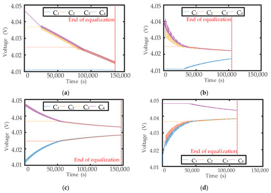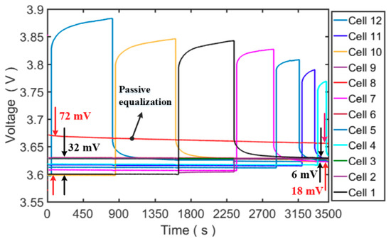 Figure 7, the voltage difference among cells during the discharging process without equalization is 789.10 mV, but it decreases to 95.10 mV, 40.30 mV, and 21.80 mV after equalization.