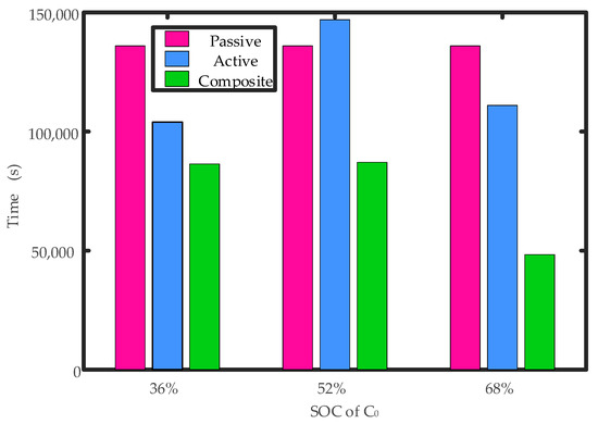 Figure 12. It can be seen that the equalization time of the active and passive equalizers is longer than that of the proposed composite equalizer in the case of the additional cell with various SOCs, indicating the proposed method has higher equalization efficiency. Moreover, the equalization efficiency increases with the increase of the SOC of the additional cell.