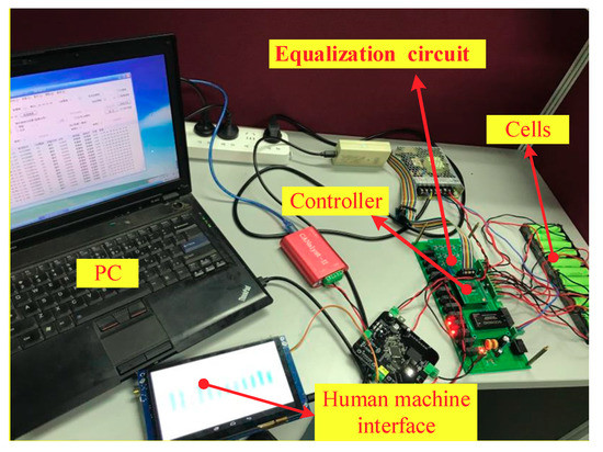 Figure 13 shows the experimental platform. The equalization circuit is the proposed circuit, and the control algorithm is realized in the controller. The data can be read by the human machine interface, and experimental data is recorded by the personal computer (PC). In this experiment, 12 cells are used as test cells for the equalizer, and a cell is used as additional cell. The parameters of the experimental cells are as follows: nominal capacity is 3200 mAh; nominal voltage is 3.6 V, lower and upper cut-off voltage are 2.5 V and 4.2 V, respectively. In the experiment, each cell has different initial SOC, and the SOC of the additional cell is the highest.