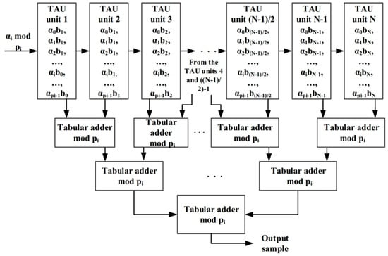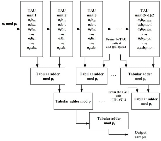 The structure of the DF operating on the basis of the finite residue field algebra. The abbreviation TAU means “Table Arithmetic Unit”.