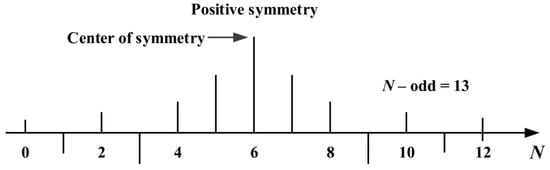 Let us consider a non-recursive DF with a symmetric impulse response (positive symmetry). An example of a symmetric impulse response for a filter of the 13th order is shown in Figure 2. A feature of the DF with symmetric characteristic is that its samples symmetrically take values equal in magnitude and sign [18].