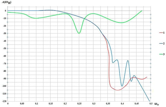 Frequency responses of the DF: 1—frequency response (FR) of the DF with the representation of its coefficients in the algebra of the finite ring; 2—FR of the positional DF with 16-bit coefficients; 3—FR of the positional DF with 8-bit coefficients.
