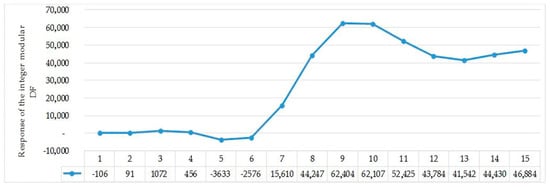 The response of the DF, shown in Figure 5 (the response of the positional DF), coincides with the response shown in Figure 6 (the response of the integer modular DF using the developed scaling method). The provided example of the estimation of the accuracy of calculating the output sample of the modular DF, which processes 16-bit input data and has 16-bit coefficients, has shown the correctness of the operation of the digital filtering algorithm implemented in the algebra of the finite residue field.